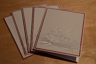 I made these last year. I'm a rather slow crafter and with my busy schedule and lack of organisation I did most of the 60 or so christmas cards the same way. Used my Cuttlebug and heat embossed glimmer as snow.